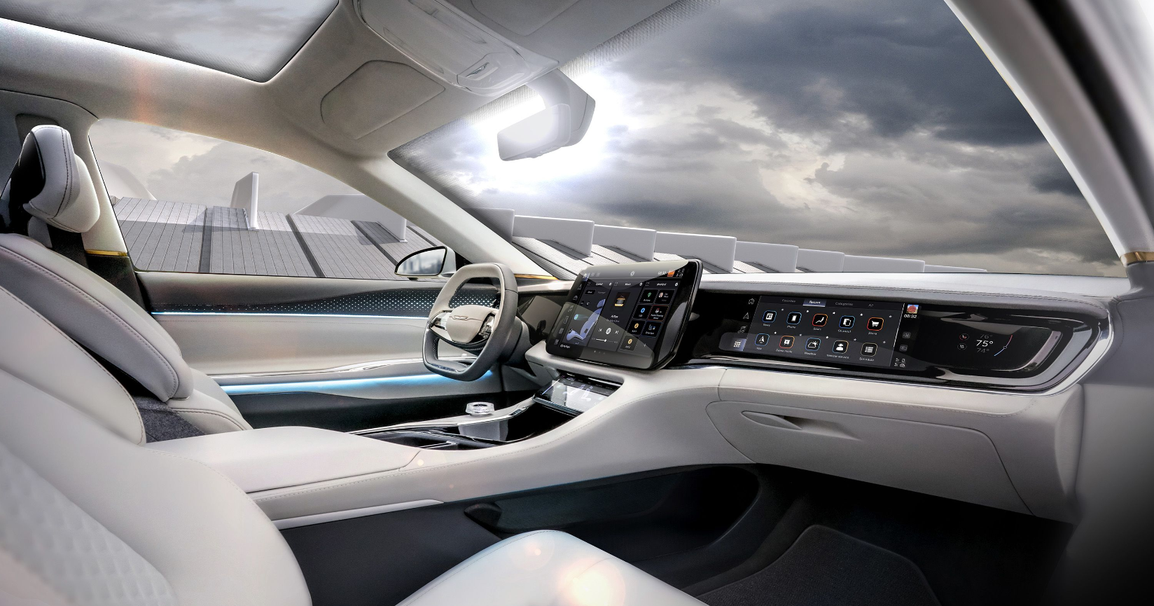The Airflow idea has a glass roof and futuristic design features, making the inside light and airy. Regarding seating, the concept car has four seats, but the actual car will probably have five seats with a bench in the back. There are several screens inside the car, including ones for the driver, the passenger, the center infotainment screen, and the screens for the back seats. There is also STLA SmartCockpit hardware on the Airflow, which makes it easy to link and customize.